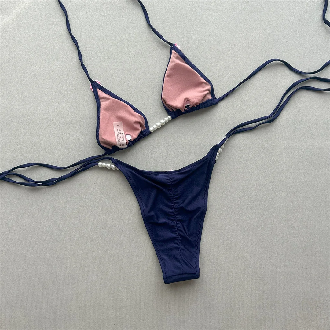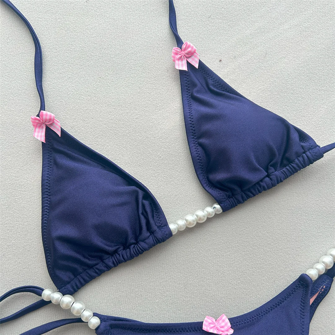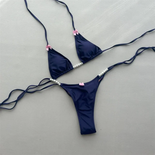 Delicate, daring, and dripping in detail — the Midnight Pearl Micro Bikini was made for beach goddesses who crave both elegance and edge. Crafted in deep navy satin-touch fabric, this design features a micro triangle top with soft pink bows and pearl accents that glimmer against sun-kissed skin. The matching brazilian bottom has a scrunch butt fit that flatters every curve and highlights your silhouette from every angle.