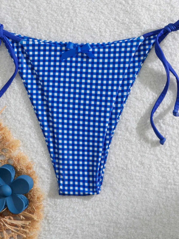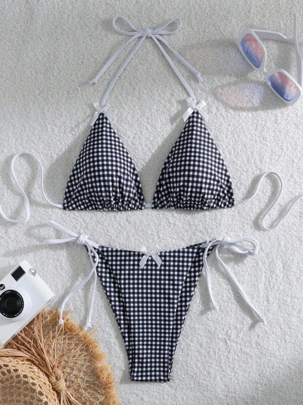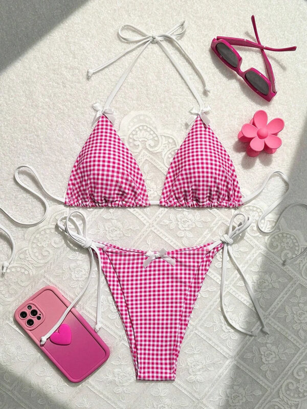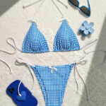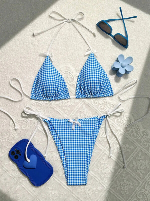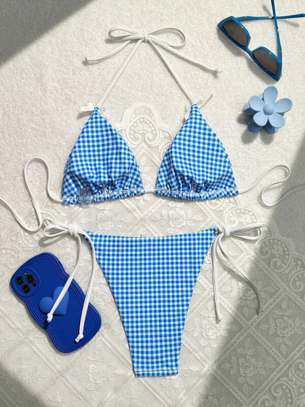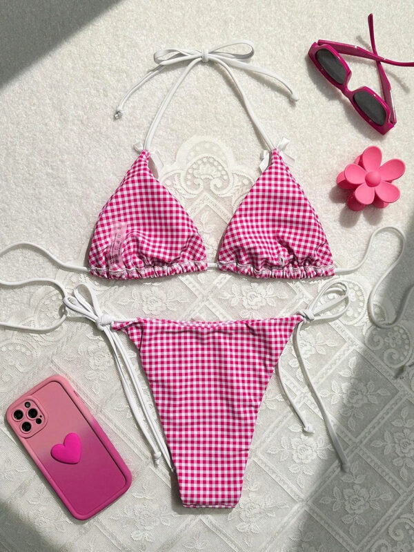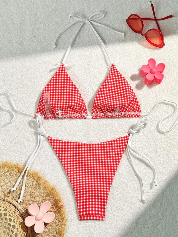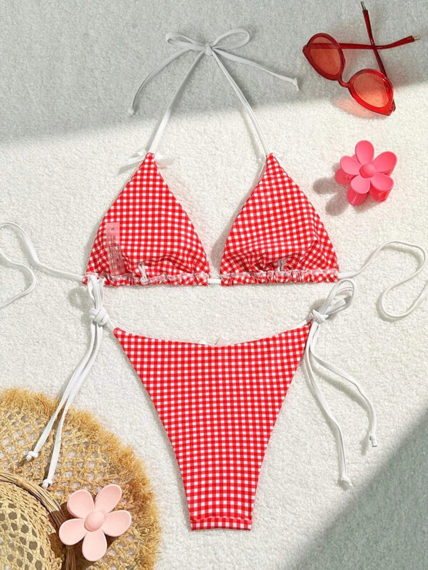 Effortlessly cute, the Sunset Charm Plaid Bikini boasts a halter style and side ties for a perfect fit. With its charming plaid pattern and available in multiple colors, you can’t go wrong with this stylish piece. Perfect for catching some rays and turning heads.