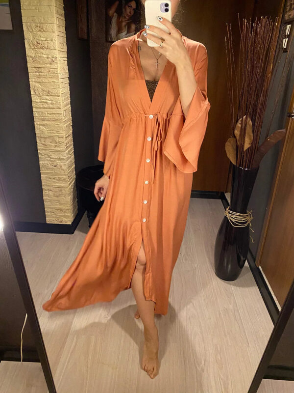 Stay stylish and protected under the sun with our Valentina Maxi Beach Dress Cover Up. The long sleeves provide added coverage while still giving you that breezy beach look. Perfect for a day at the beach or a poolside party. Enjoy the best of both worlds with this versatile cover up.