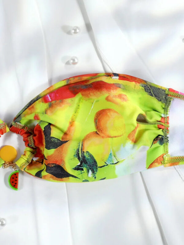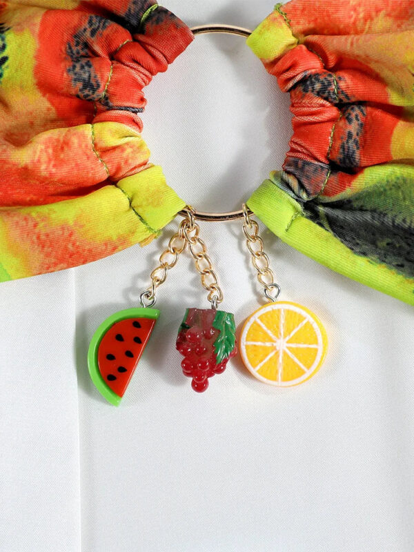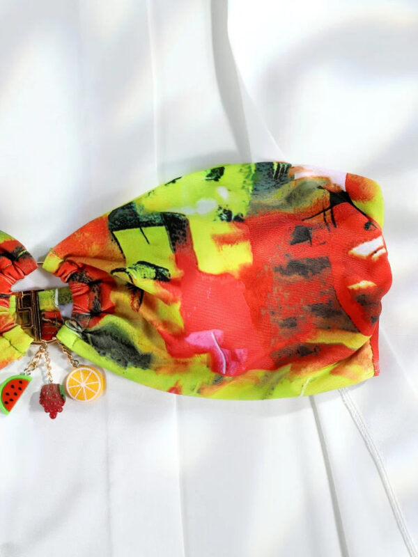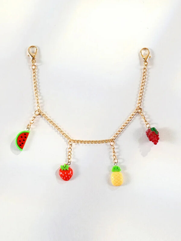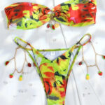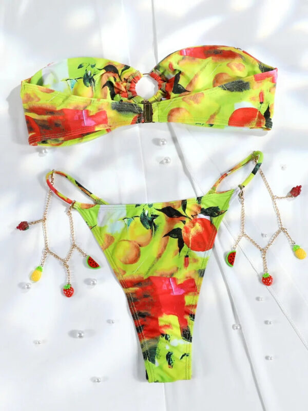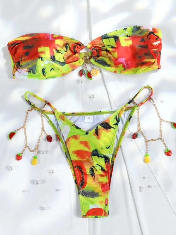 Elevate your beach style with our Fruit Paradise Bandeau Bikini. The delicate fruit charm chain details adds a stunning, playful and whimsical touch to this bikini. The lightweight charms move gracefully with every step, making it the perfect choice for a dynamic and fun beach look.