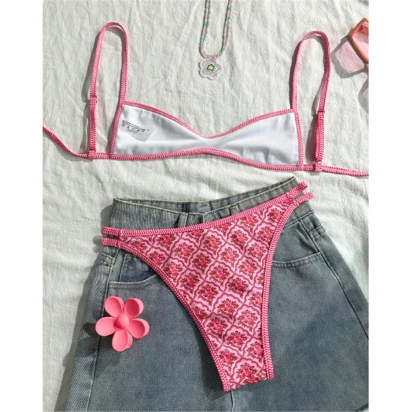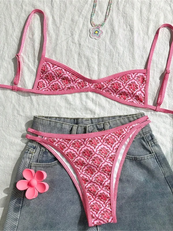 The top features a captivating underboob cut complemented by delicate floral prints, creating a bold yet feminine silhouette. The straps are designed to offer a secure fit while allowing you to move freely, framed by an aesthetic that celebrates your natural curves. Below, the bikini bottom hugs the hips comfortably, defining your waistline and accentuating your shape, perfect for spontaneous swims or lounging by the shore.