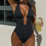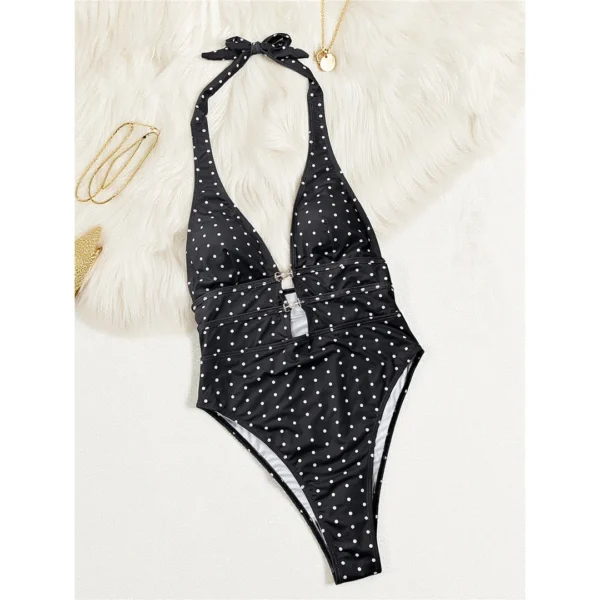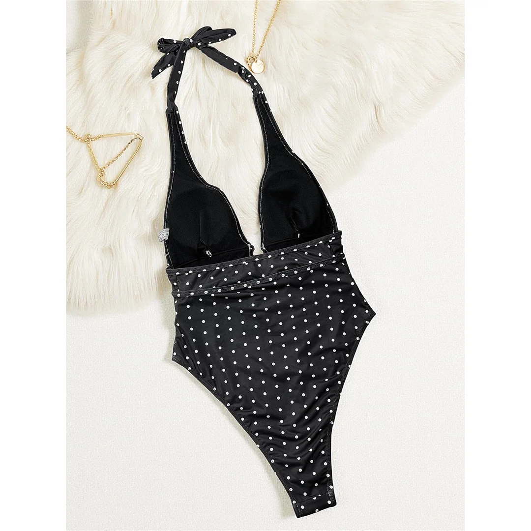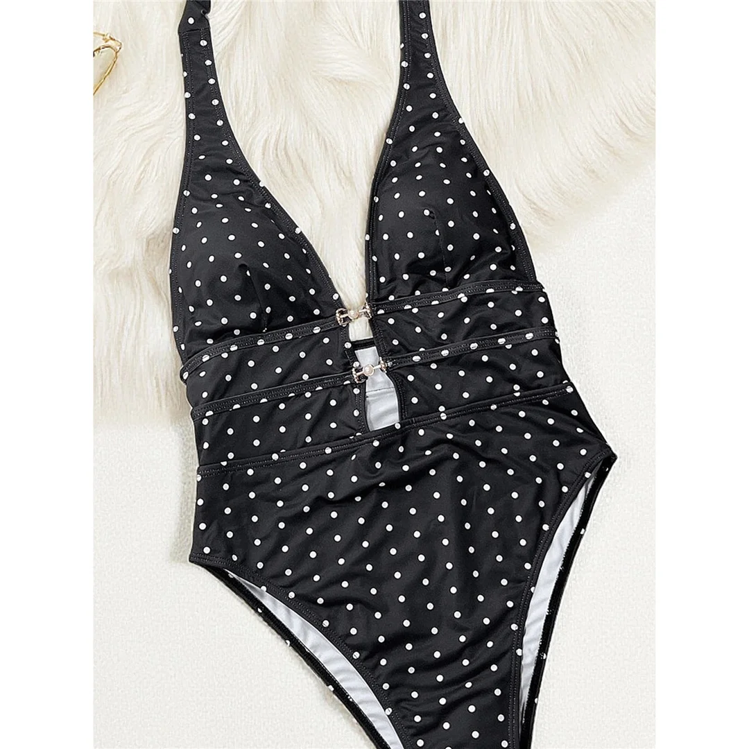 Black Polka Dot Halter One-Piece Swimsuit with Cut-Out & Silver Chain Detail