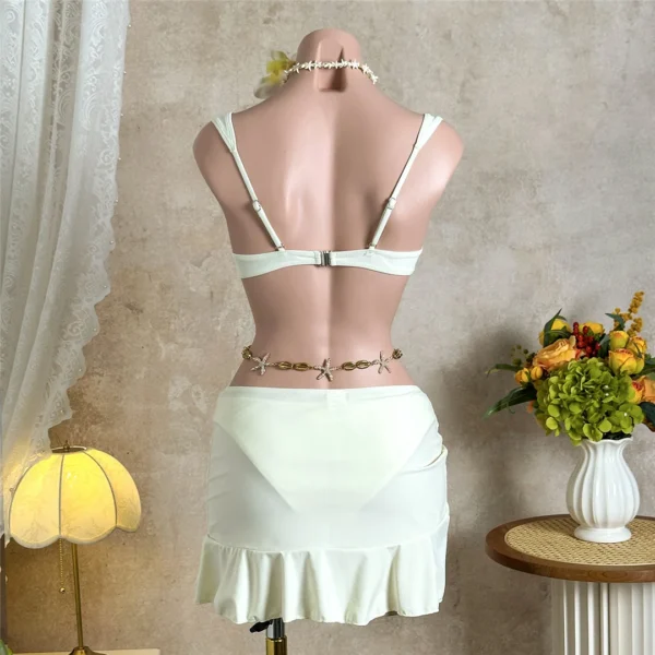 Completing the trio, the ruffled skirt adds a stylish layer that gracefully flutters as you stroll along the sandy beach. The skirt’s light, fluttering fabric epitomizes carefree style, making it a perfect companion for beach parties or leisurely afternoons by the pool.