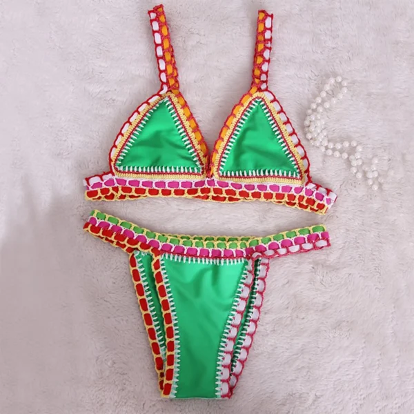 The vibrant colors pop beautifully against tanned or fair skin, and the contrast stitching creates a super-flattering frame around your curves. Adjustable straps and a comfortable fit make this bikini just as easy to wear as it is eye-catching.