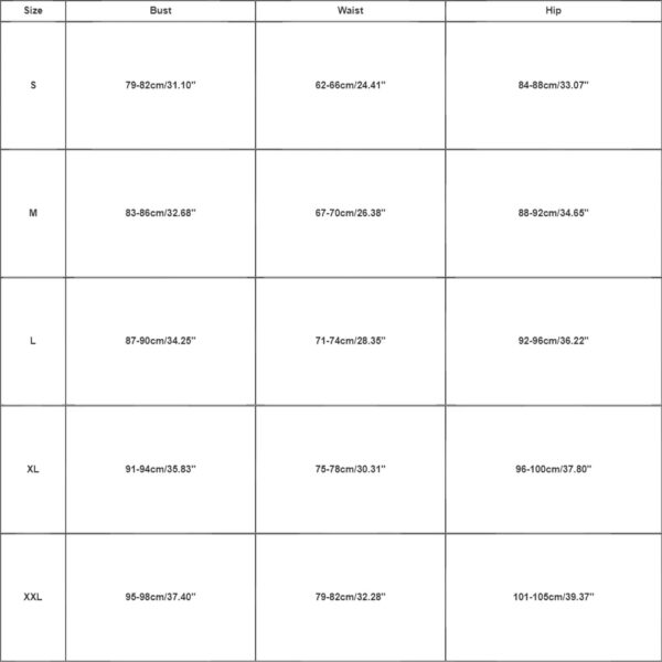 | Size:XXL | Bust:95-98cm/37.40” | Waist:79-82cm/32.28” | Hip:101-105cm/39.37” |