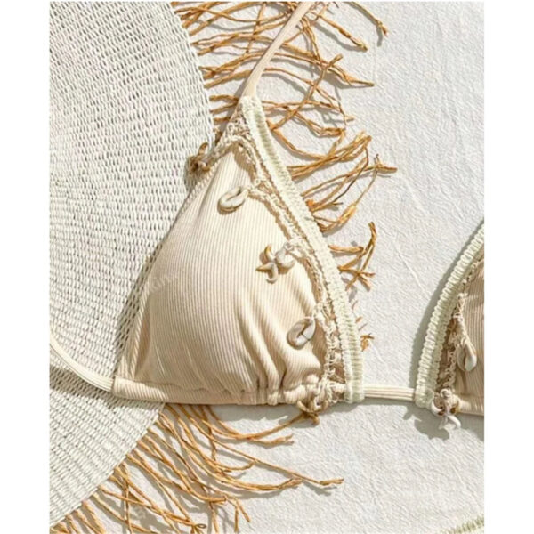This stylish halter bikini features delicate seashell details, adding a touch of beachy charm. Embrace your love for the ocean with this unique and eye-catching bikini. Perfect for lounging on the sand or diving into the waves.