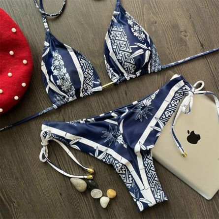 A classic triangle top with thin halter ties sits lightly on the body, giving just enough coverage with a fit you can adjust to exactly where you want it. The matching string bottoms tie at both hips, keeping the silhouette clean and the tan lines minimal. Nothing fussy, nothing overdone — just a really good bikini.