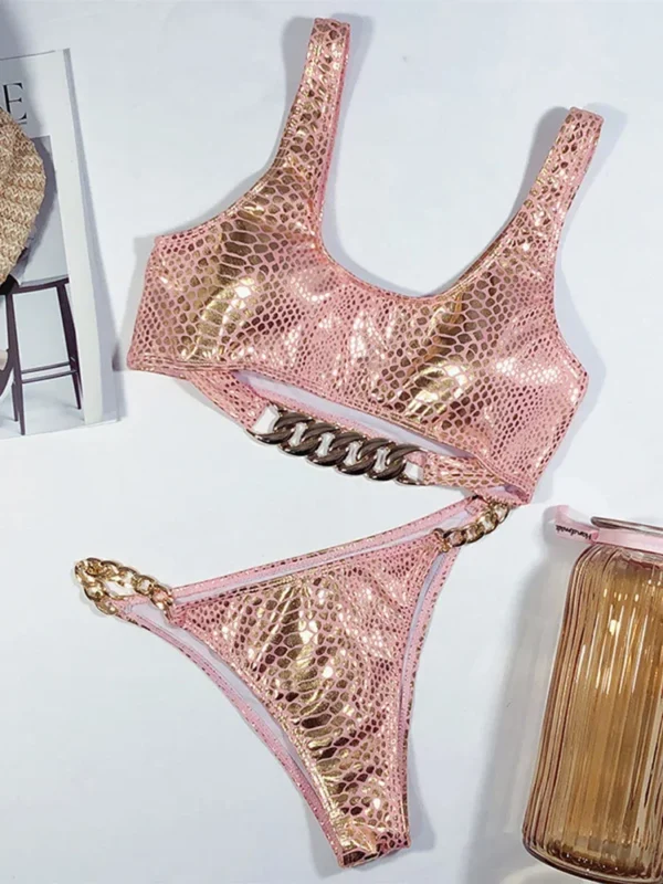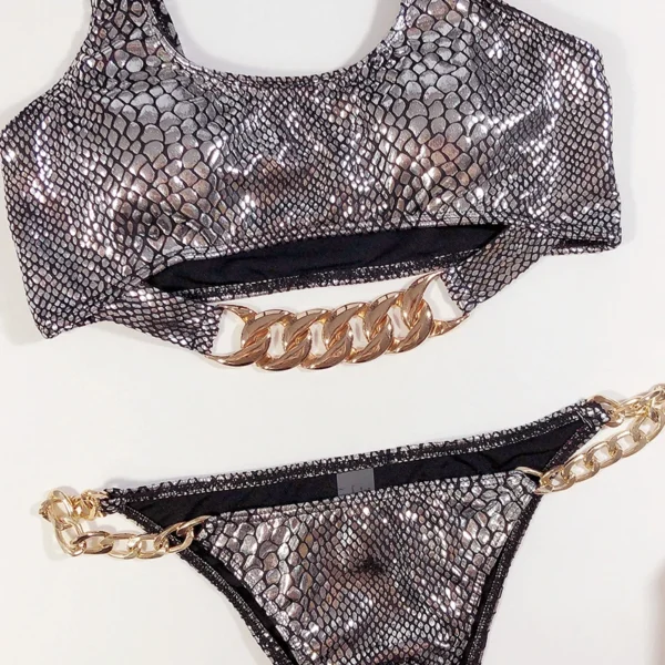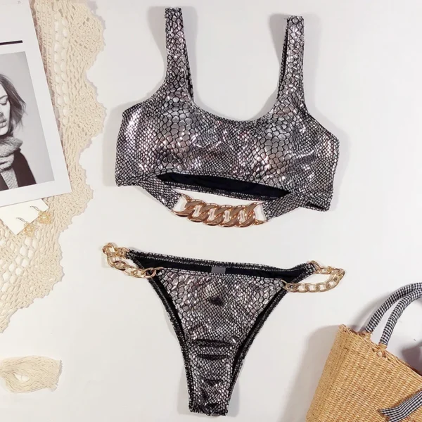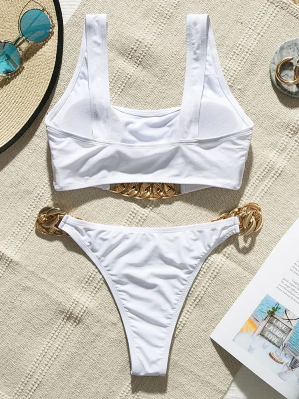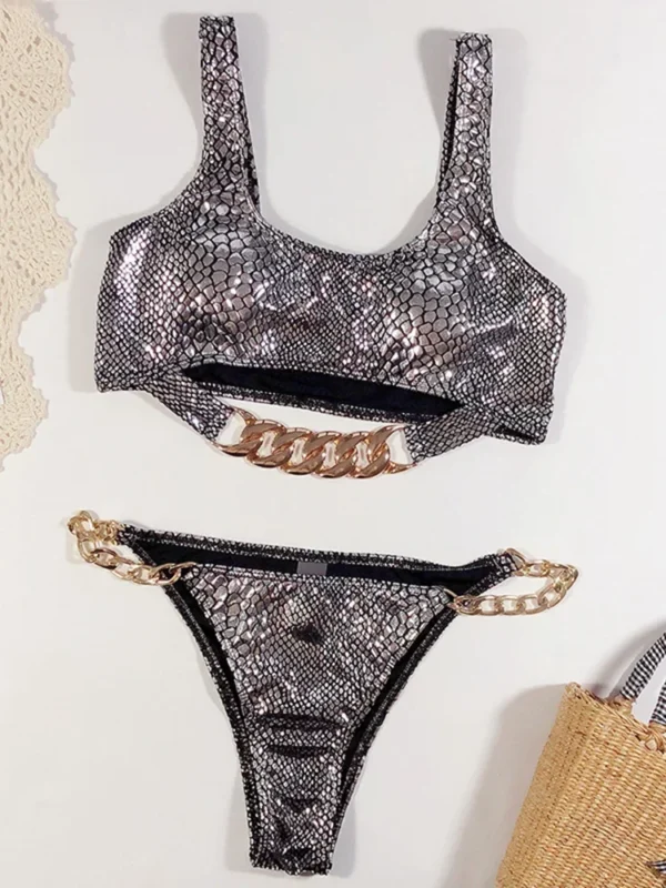 The top features a daring underboob cut, beautifully showcasing your silhouette while maintaining an air of sophistication. The delicate chain detail adds a touch of elegance, bringing a hint of glam to your beachside look. Its straps wrap around with grace, ensuring a comfortable fit that allows you to move with ease.