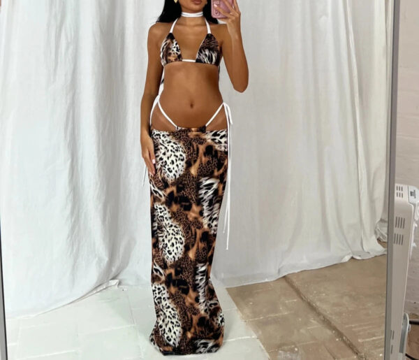 Introducing Valentina’s leopard print 3-piece bikini set. Stand out on the beach with this fierce and trendy design. Embrace your wild side and make a statement with the unique leopard print.