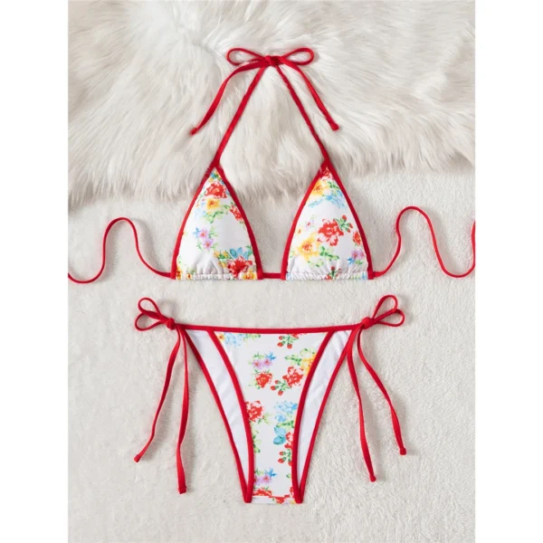 This white triangle bikini is covered in a delicate floral print — small blooms scattered across a clean white base — then finished with bold red string ties that run along the top, neck, and bikini bottoms. That contrast between the soft print and the vivid red cord is what makes it.
